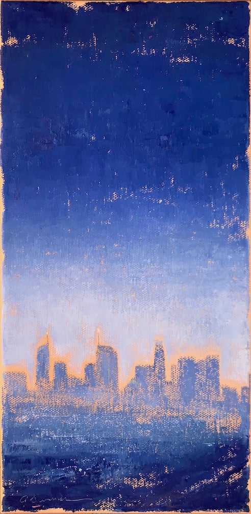 My long-term love affair with cities that meet the sea inspires me to paint city streets, freeways, skylines, beaches by urban centers, and the commonplace elements you would find along the way. Colorful relics or objects such as road cones, neon signage, billboards, headlights, power lines, or trash cans are included as quiet monoliths in the landscape.