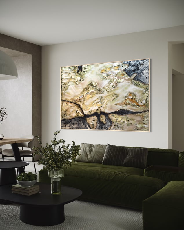 Stockholmsspegling, (2025) Original painting on 3 cm deep canvas, framed in a floating frame Size: 120 × 180 cm The painting offers a unique bird’s eye view of Stockholm, capturing the city’s contours, architecture, and pulse from above. With detailed brushstrokes and rich tones, the work highlights the city’s character and vibrancy, offering viewers a fresh perspective on Stockholm. All original paintings are unique and signed with the artist’s name, year, and personal signature. A certificate of authenticity is included.