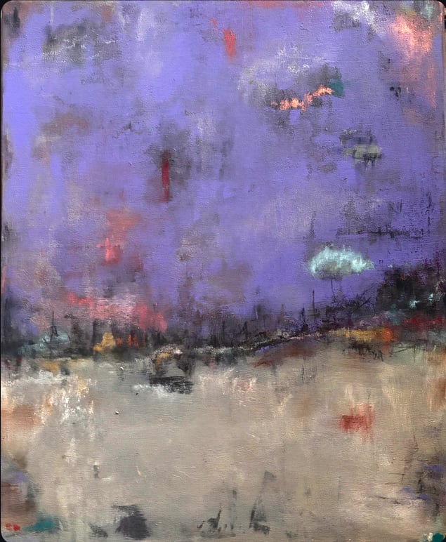 An abstract landscape with a moody violet sky and soft, earthy foreground. Hazy brushstrokes and muted colors are accented by touches of red, turquoise, and black, creating a dreamy, atmospheric feel.