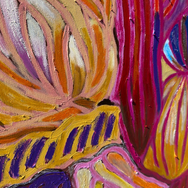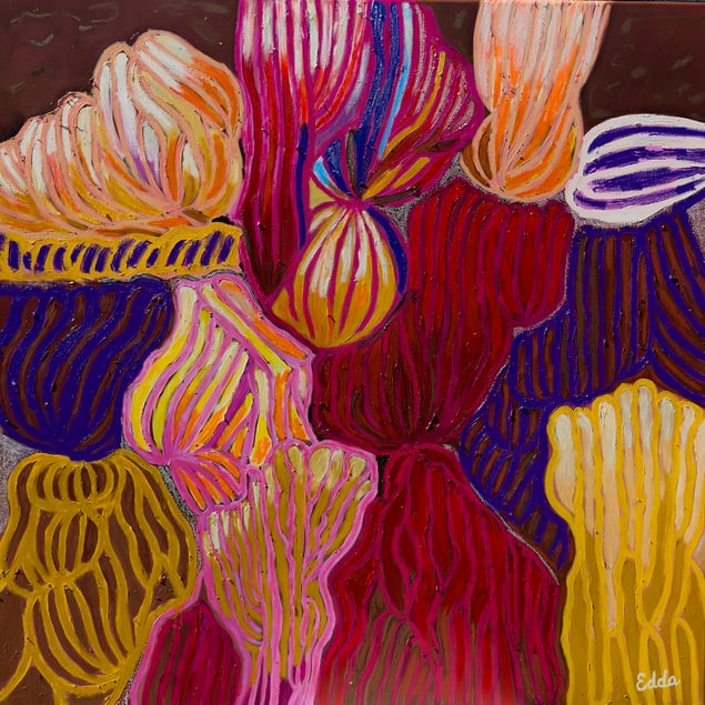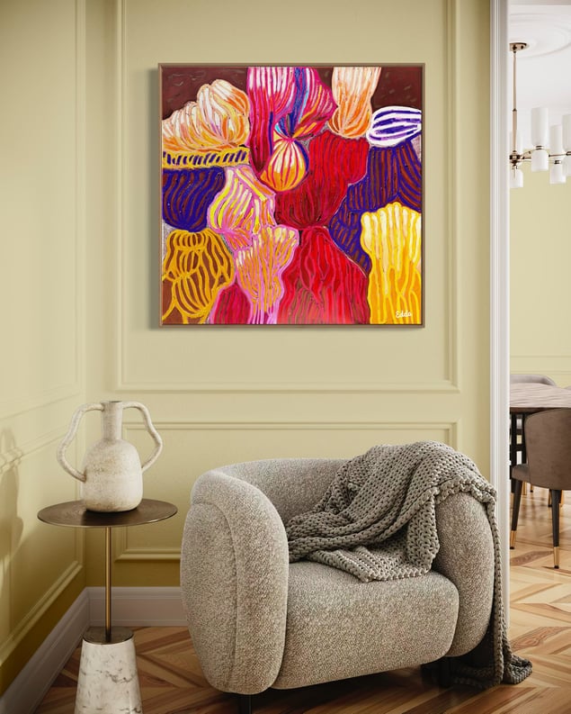 Roots are what connect us and nourish us. Roots of Radiance was born from a need to release, to feel, to express what words couldn’t hold. This artwork features an abstract composition of linear shapes, vibrant colors, and textured layers. Every line, every layer of color maps the terrain of emotion—raw, vulnerable, and healing. It’s not just abstract. It’s a self-portrait in motion. The interplay of blues, greens, yellows, and hints of orange creates a lively atmosphere, evoking a sense of movement and energy. The arrangement invites viewers to explore its depth and complexity, suggesting themes of natural rhythms and emotions. Size: 100×100 cm Medium: Oil on stretched canvas