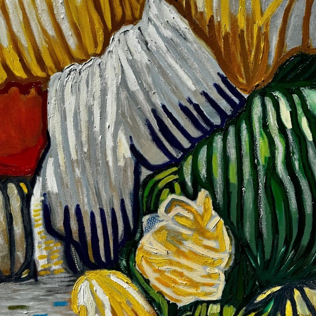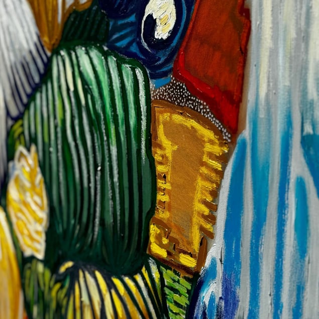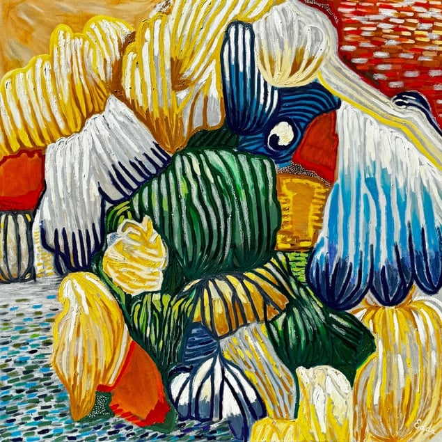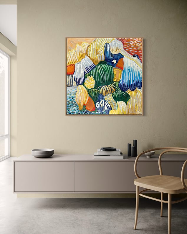 Roots are what connect us and nourish us. Roots of Radiance was born from a need to release, to feel, to express what words couldn’t hold. This artwork features an abstract composition of linear shapes, vibrant colors, and textured layers. Every line, every layer of color maps the terrain of emotion—raw, vulnerable, and healing. It’s not just abstract. It’s a self-portrait in motion. The interplay of blues, greens, yellows, and hints of orange creates a lively atmosphere, evoking a sense of movement and energy. The arrangement invites viewers to explore its depth and complexity, suggesting themes of natural rhythms and emotions. Size: 100×100 cm Medium: Oil on stretched canvas
