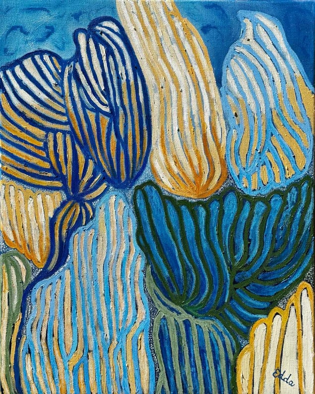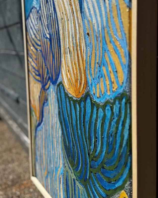"Roots of Virtue" captures the essence of our connections and the nourishment they provide, embodying the profound journey of release and expression that transcends words. This striking artwork presents a dynamic abstract composition, richly layered with vibrant hues and intricate linear shapes. Each contour and burst of color traces an emotional landscape—raw, vulnerable, and ultimately healing. Far more than mere abstraction, this piece serves as a dynamic self-portrait in motion, inviting introspection and dialogue. The harmonious blend of blues, greens, and yellows infuses the canvas with a spirited energy that resonates deeply within the viewer. As you delve into its depths, you are beckoned to explore an interplay of natural rhythms and emotions captured within. "Roots of Virtue" is not simply a visual experience; it is an invitation to connect with the core of your own story, making it an essential addition to any discerning collection.