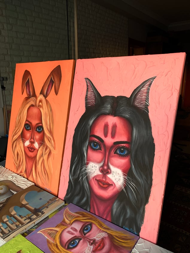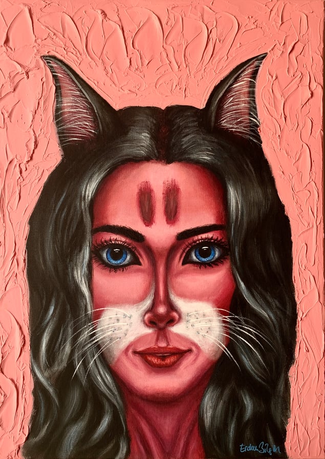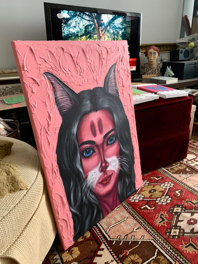 “CatLady 3” - This is the third painting from the CatLady series. I'm keeping the first example for myself. CatLady is a character who is partly human and partly cat with cat ears and whiskers. More on the human side compared to the CatWoman series. I start every character with a rough outline but without imagining how she will appear. The characters just reveal themselves along the way. All have different personalities. This is not something I am controlling while painting. I’m simply playing with colors, make brush strokes and channeling as she wants how she wants to appear. It is all up to that character. This time I wanted her to have black hair and the rest has revealed itself as she wanted. As always… what do you think her personality is?