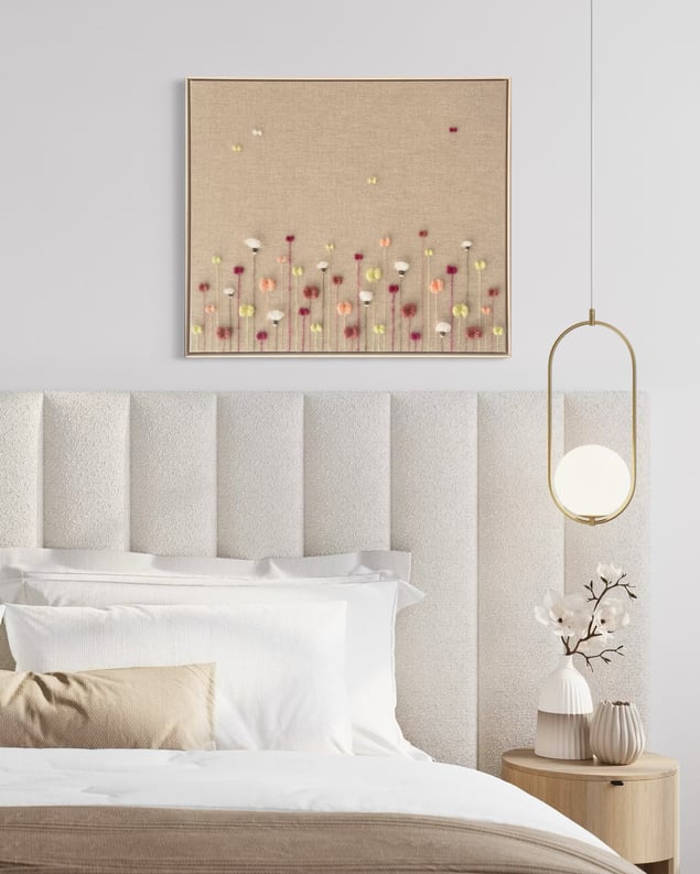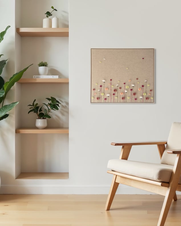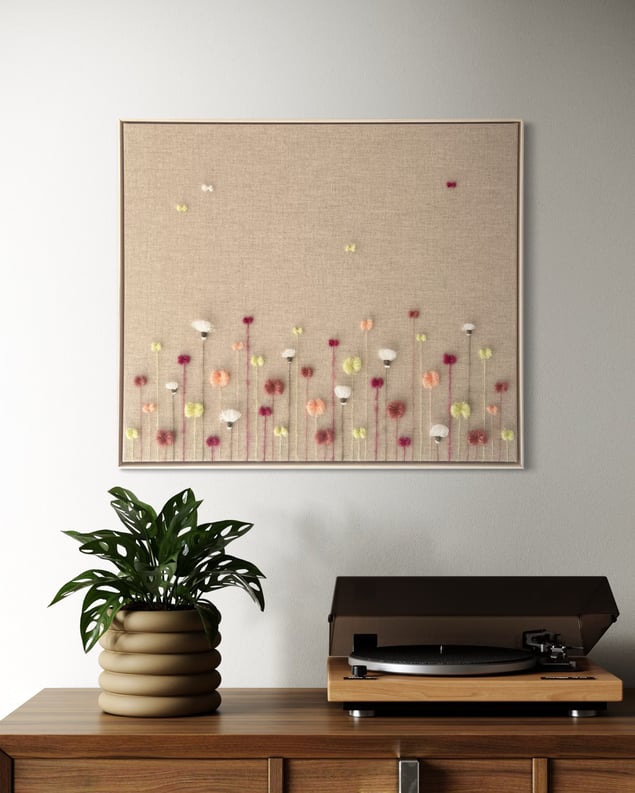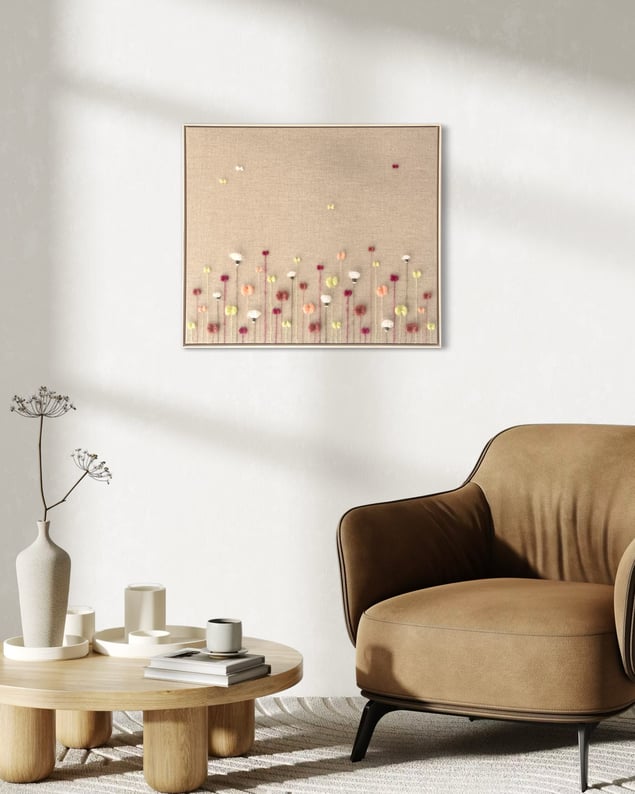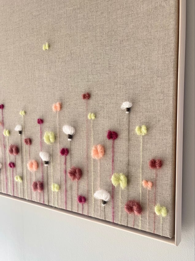 Eva Katrín is a contemporary textile artist based in Gothenburg, Sweden, where she lives with her husband and their three children. Her creative journey began early in life, but it was in 2020 that she started sharing and selling her work in Iceland. Today, Eva is known for her soft, sculptural floral compositions, a visual language she has been developing and refining over the past year. Through a unique merging of textile and visual art, she creates richly textured, three-dimensional works woven with yarn on raw linen canvas. Her handwoven botanical abstractions reflect shifting moods, seasons, and emotional landscapes. Each piece invites stillness and intimacy, a quiet celebration of softness in both nature and form, encouraging the viewer to pause, breathe, and feel. Alongside her art practice, Eva has worked as a registered nurse. She has gracefully balanced her roles as caregiver and creator, nurturing a part-time artistic career rooted in emotion, material sensitivity, and visual depth.