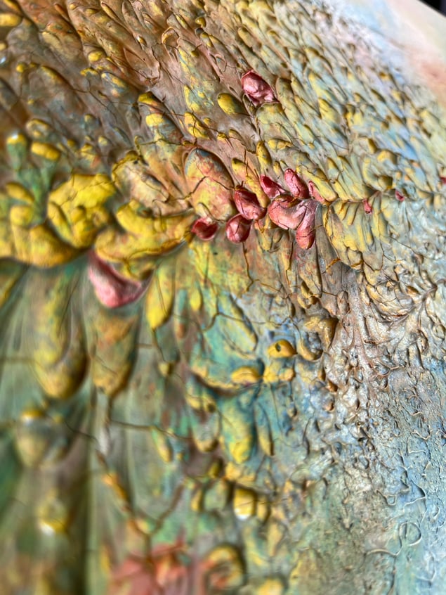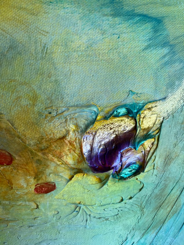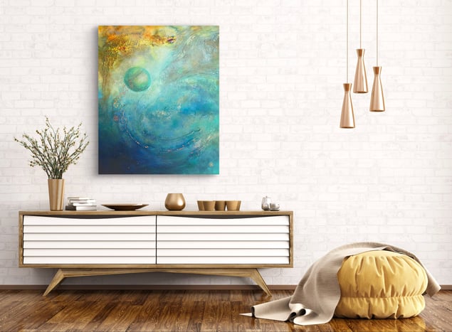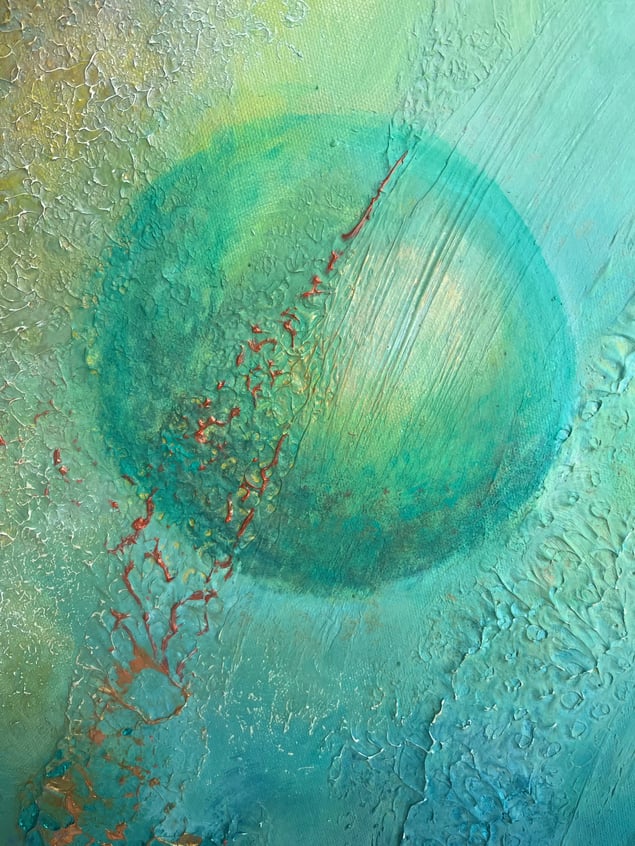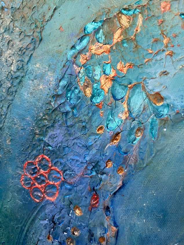”Gaia dreaming” är ett abstrakt verk målat med akryl på canvas, där strukturmassan bygger upp djup och rörelse i ytan. Färgskalan domineras av turkos, akvamarin och djupa blå toner, som kontrasteras av varma inslag av guld, orange och koppar. Ljuset tycks strömma fram ur duken och skapar en känsla av både kosmos och ocean. De organiska formerna ger associationer till jordens egen puls – en blandning av havets vågrörelser, planetens runda former och universums oändliga sfärer. Den texturerade ytan och de många uppbyggda lagren gör att färgerna nästan rör sig, som om målningen andas och ständigt förändras. Titeln ”Gaia Dreams” förstärker känslan av att vi betraktar Moder Jords drömmar – ett inre landskap där natur, vatten, himmel och energi flyter samman till en helhet. Det är ett verk som bjuder in betraktaren till eftertanke, till att både vila i dess mjuka färgflöde och samtidigt upptäcka dess kraftfulla, vibrerande energi. Verket har en tunn flytande guldram i trä.