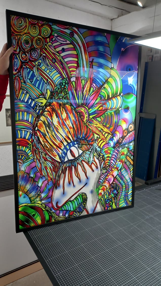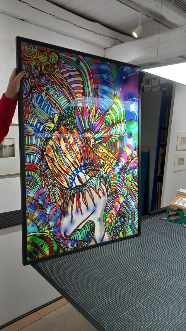 Join us down the rabbithole on a twelve peice journey of awakening, struggle and tales from our collective unconscious! - Museum/Archive standard with a minimum of 100 years lifespan. Acid-free paper, custom-build frame, non-reflective glass & dustproof seal all according to ISO-9706 standards. - Artwork delivered with certificate of authenticity, legal document of ownership, personal letter, signed by the artists themselves. - Personal delivery by the artists themselves. (look at additional shipping information for info) - Extremely limited edition (3-5 depending on size) 3 sizes: 60x85cm / 85x120cm / 100x140cm 2700€ / 3000€ / 3300€ per size respectively. Artwork #12 in the exclusive limited edition series "Det som är svårast att se" (The hardest thing to percive) Psychedelic Art by Josephine Lundqvist & Johan Wretman. The final craftmanship with frames, glass and printing done by Niklas Storm/Fotoverket. An analog-digital-analog workproccess from pen and paper and mixed techniques on paper, via the digital universe and back out again on the other side, with handmade custom build frames, non-reflective glass on acid-free paper and with worldclass printing. Welcome! / Johan & Josephine - HeNåAnne