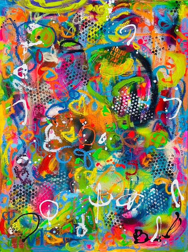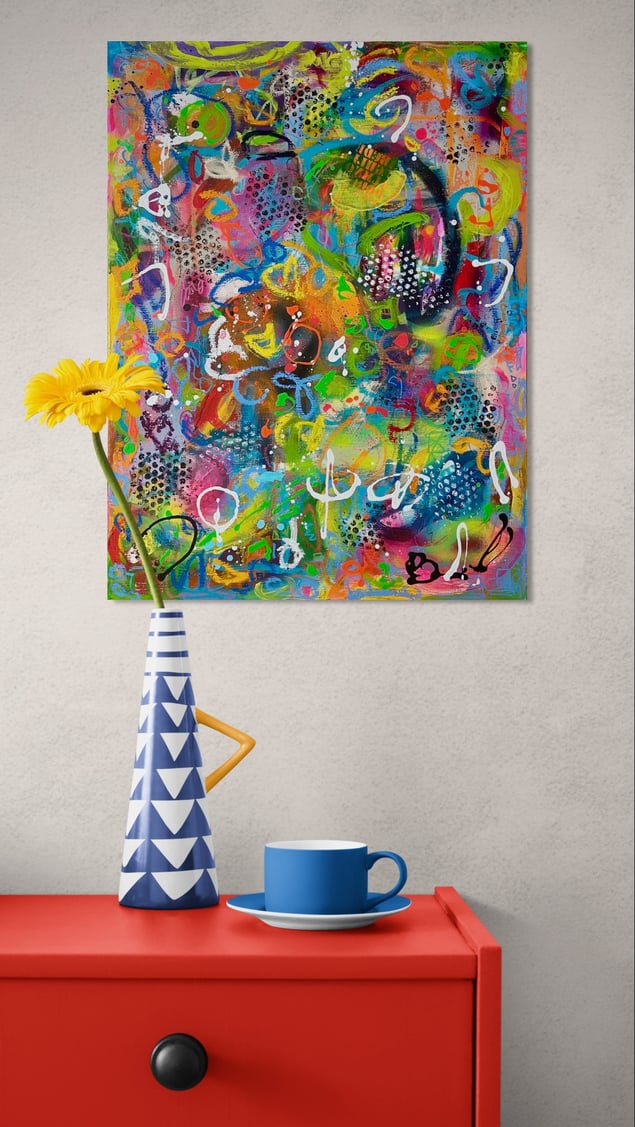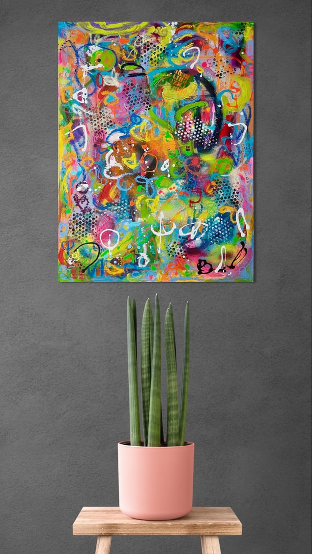 A vibrant painting inspired by Bronx NYC graffiti art features a dynamic mix of bold, bright colors and intricate markings, all expertly rendered using a captivating blend of mixed media. It captures the essence of the Bronx's street art culture, showcasing the raw energy and creativity that define this urban art form.