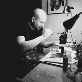 Jesper is a multifaceted creator, working as both a painter and sculptor, who has innovatively integrated coffee into nearly all of his artwork. His journey with coffee as a medium began unexpectedly; after installing a new concrete tabletop in his kitchen, he sought a way to protect it from the acidity of coffee. This led to the unconventional practice of placing watercolor paper beneath their coffee machine, where they discovered intriguing animal shapes formed in the resultant stains. Captivated by these organic patterns, he began to preserve the stained papers, using coffee as paint to create vivid works. As his artistic exploration progressed, he expanded his technique to include painting on canvas, employing a unique blend of coffee mixed with various mediums to enhance his creations. In addition to his paintings, the artist's sculptures also prominently feature coffee, with coffee beans artfully incorporated into the resin used in his work. Each piece not only showcases their innovative approach but also pays homage to the humble coffee bean, making their art a distinct fusion of everyday materials and artistic vision.