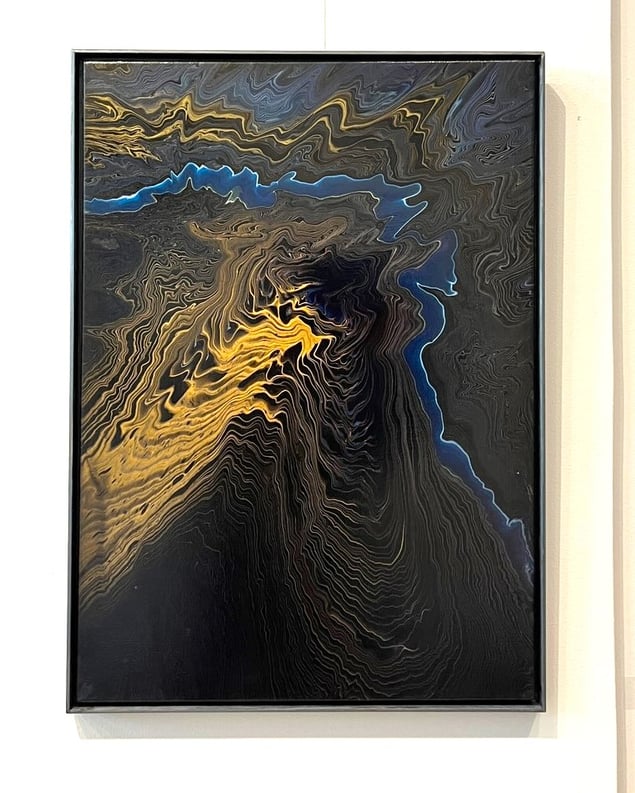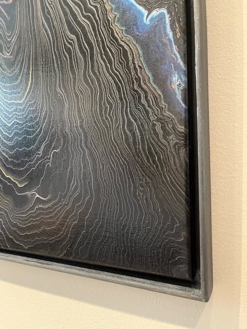 Fluid Art - acrylic ring pour on stretched canvas, framed with wooden frame painted in graphite