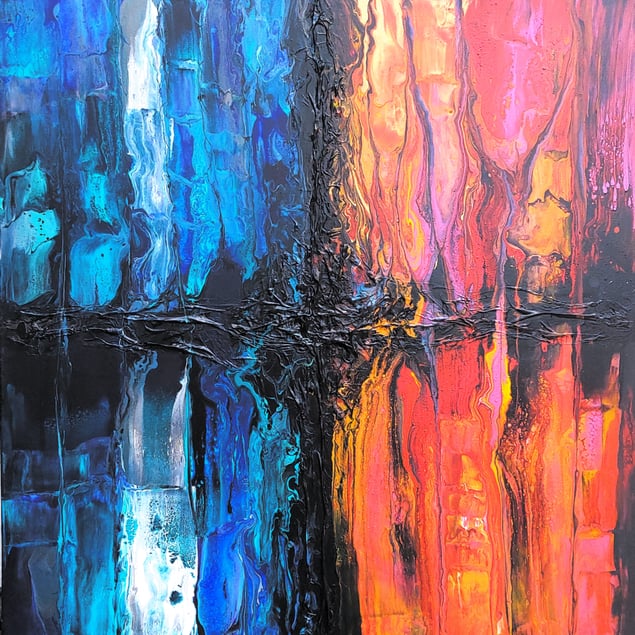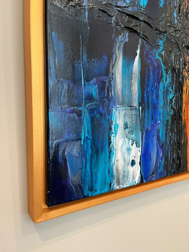 Acrylic Fluid Art combined with silk paper structure incl. painted wooden frame
