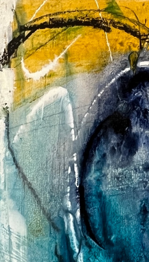 Akryl, penna, marmorpulver skapar textur och tusch på pannå. Inramad