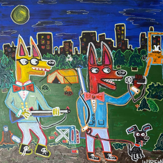 Two dogs dressed as hunters engage in a playful nighttime adventure under a vibrant moonlit sky.