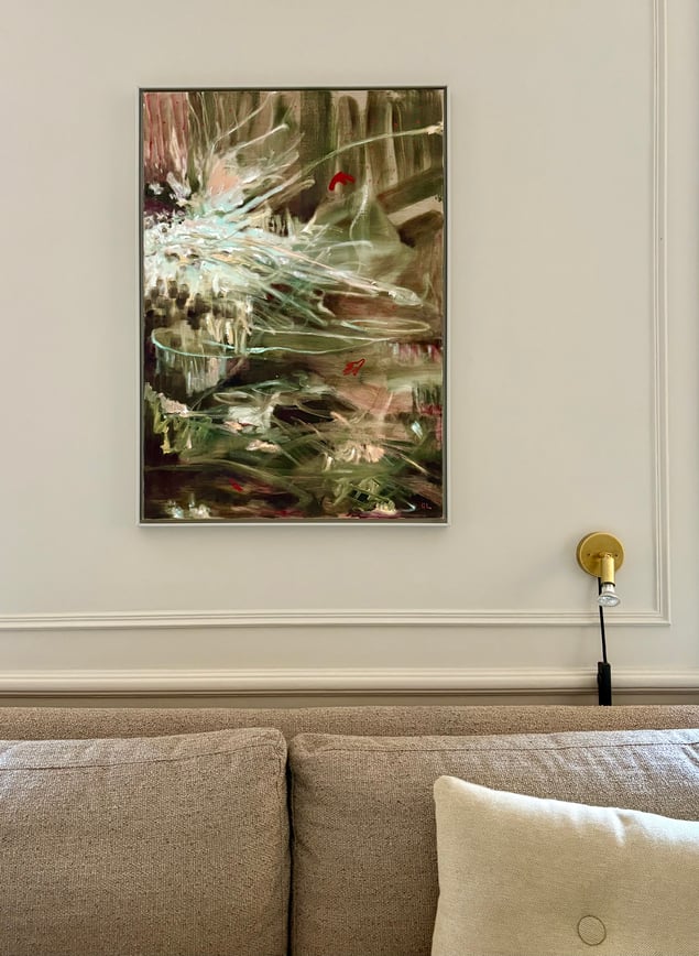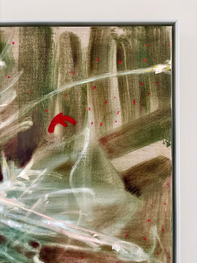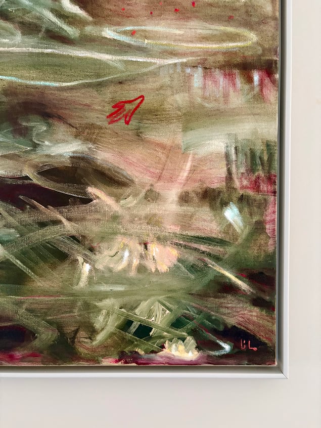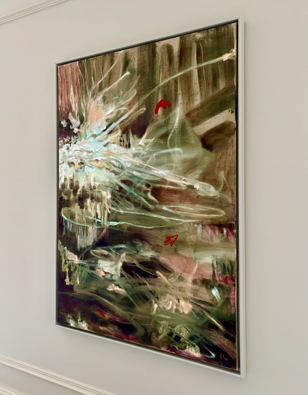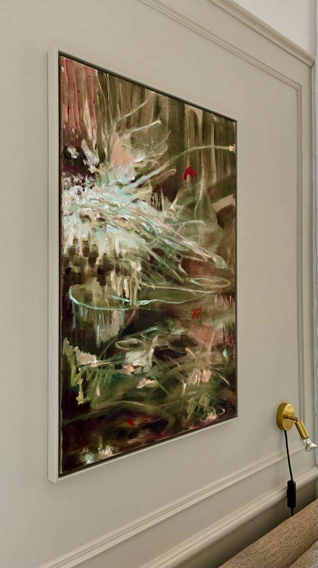 Som en viskning av naturens inre rörelse bryter målningen fram – ett ögonblick av upplösning och återfödelse. De gröna tonerna bär spår av jord och minne, medan ljusets explosion i vitt och turkos känns som ett andetag av livets ursprung. Små röda markeringar vibrerar som tecken, nästan som fåglar i flykt eller impulser av blod och vilja. Verket rör sig mellan stillhet och storm, där det osagda får form – en plats där tid och materia löses upp till ren närvaro.