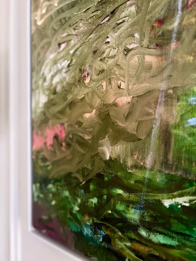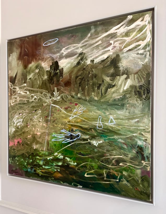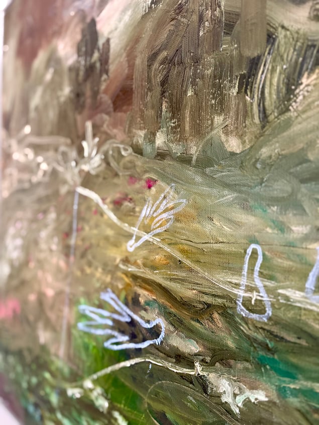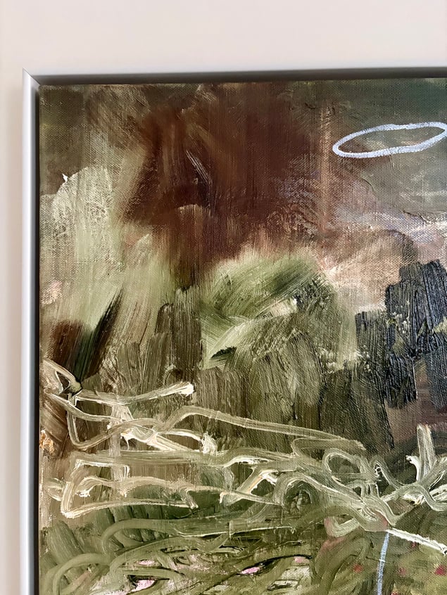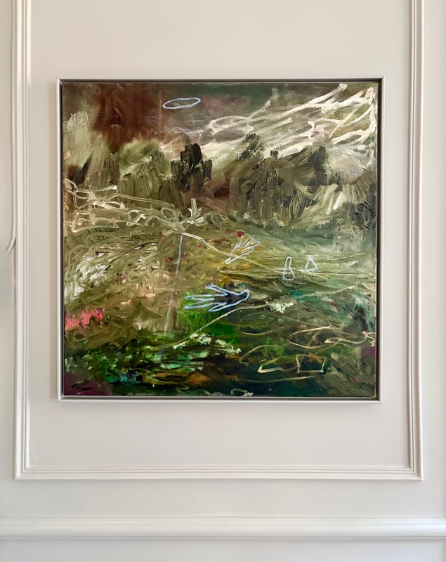Som en vind över en glömd dal rör sig färgen här — jord, dimma och ljus i ett enda andetag. De gröna och bruna tonerna pulserar som minnen av växtlighet och förgängelse. De tunna ljusa linjerna — som tecken, fåglar eller tankar — svävar ovanpå, lätta som rörelser i drömmen. Målningen balanserar mellan landskap och inre tillstånd, mellan det synliga och det anade. Det är som om naturen själv försöker minnas sig själv.