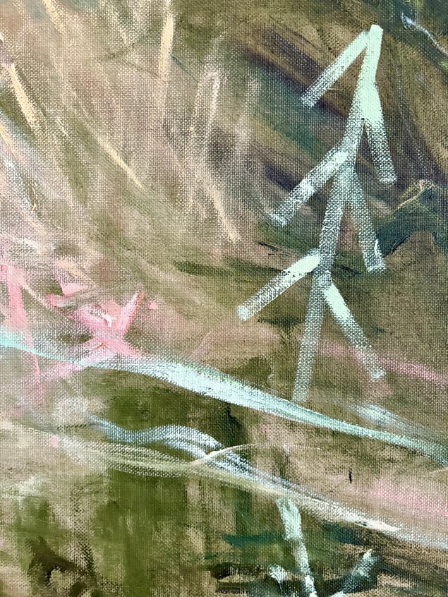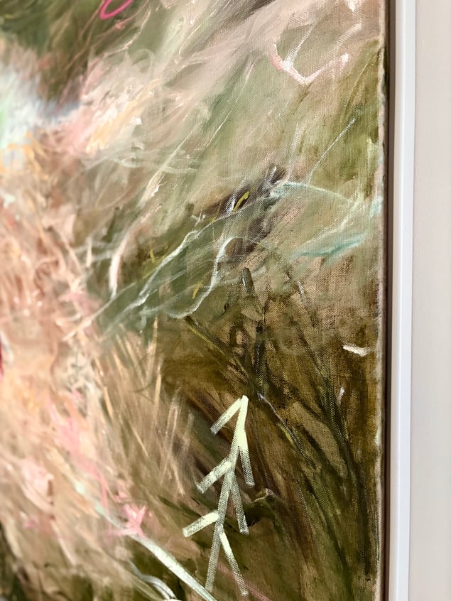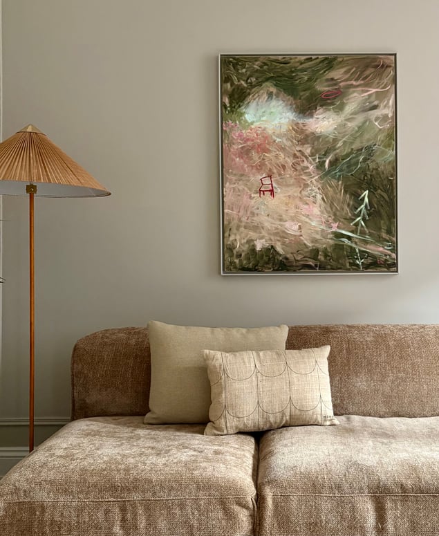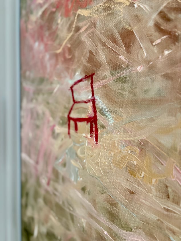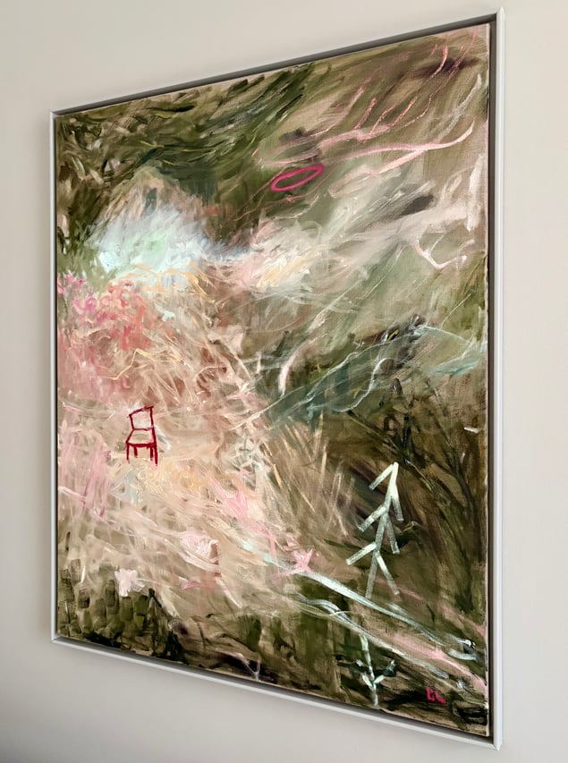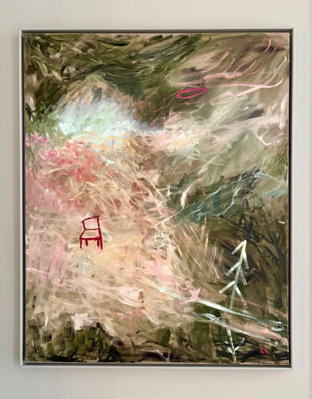 I Mana Trios målning rör sig färgen som vind genom minnet. Skikt av grönt, rosa och jord blandas till ett landskap mellan dröm och verklighet. Mitt i rörelsen står en ensam röd stol – stilla, väntande, som en punkt av mänsklig närvaro i det upplösta. Ljuset tycks stiga inifrån färgen, där intuition och kontroll möts. Målningen talar om övergångar, om ögonblicket innan något blir till. I detta mellanrum vilar poesin – en andning mellan närvaro och frånvaro, mellan natur och inre rum.