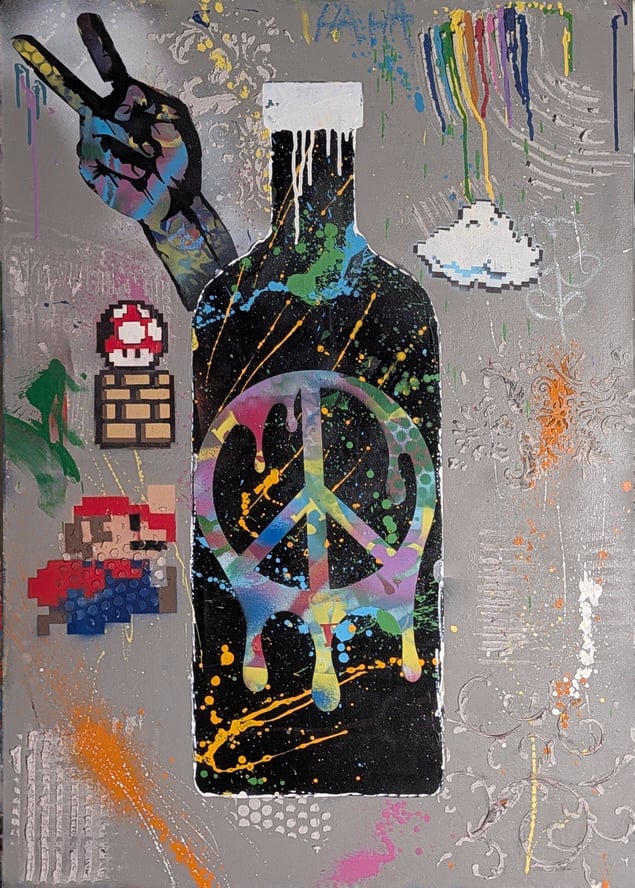 This is a molotov cocktail of pop culture, nostalgia, and rebellion. A black spray-painted bottle takes center stage splattered with paint, tagged with a rainbow peace sign while pixelated icons like Mario and a mushroom power up anchor the chaos. The peace hand throws up two fingers against a textured grey backdrop loaded with drips, stencils, and graffiti energy. It's retro gaming meets street art protest, wrapped in ManiPopart's signature "fuck your rules" attitude.This piece speaks to anyone who grew up on controllers and cartridges but refuses to play by someone else's game. It's layered, chaotic, and unapologetically loud art for collectors who want their space to feel alive, not polished. If you're looking for something that mixes nostalgia with edge and doesn't give a damn about playing it safe, this is it.