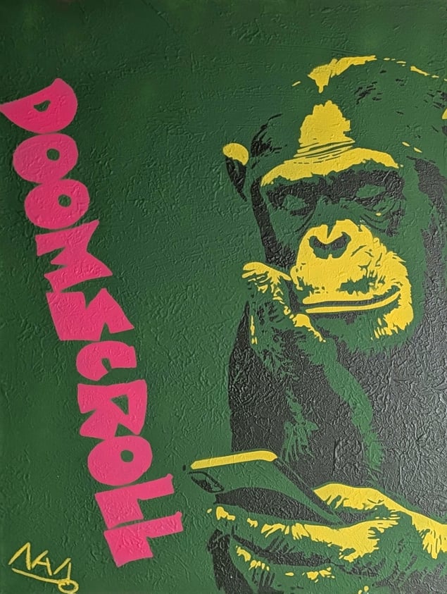 "Doomscroll" is a punchy pop art piece that nails the state of modern digital misery. A bored-looking chimp is glued to its phone, rendered in sickly yellows and greens with a texture that’s as gritty as your newsfeed. The neon pink "DOOMSCROLL" graffiti down the side flips the concept right in your face—no subtlety, just a brutal mirror. It’s satirical, visually loud, and makes zero attempt to comfort anyone who’s addicted to endless social media despair. This isn’t decoration; it’s a call-out and a challenge. If you want art that roasts the culture of mindless scrolling and passive doom, this is it.
