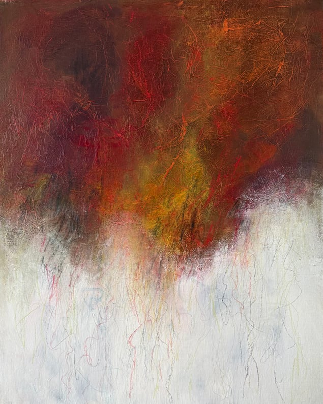 Mixed media on linen canvas; acrylic, silk paper, pencil, charcoal and crayons