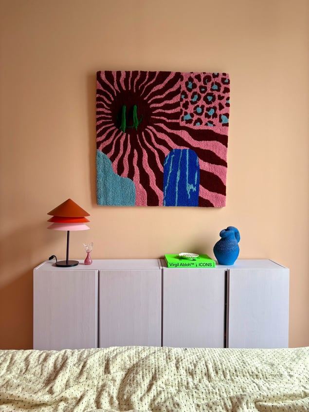 Allt eller inget is a bold tufted wool artwork that explores contrasts and movement. With its dynamic sunburst pattern, abstract shapes, and rich texture, the piece evokes a sense of energy and depth. Handcrafted with high-quality wool, it features a sturdy backing and is signed by the artist for authenticity. The interplay of organic forms and geometric elements creates a striking visual balance, making Allt eller inget a captivating statement piece for any space. Artwork by Maria Vister.