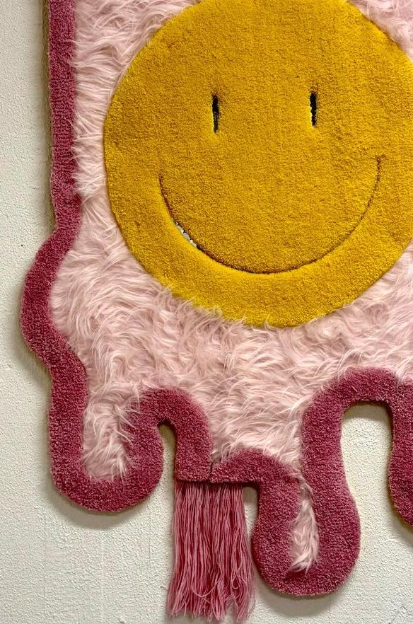 Experience the captivating interplay of contrasts in "The Wonderful Smile," a textile artwork that invites contemplation on the nature of happiness. At its heart, a vibrant yellow smiley face—a universally recognized symbol of joy—emerges triumphantly from a lush backdrop of plush pink fabric, elegantly framed by deep magenta hues. This striking composition creates an illusion of the smile melting, as if the very essence of joy is delicately slipping away, inviting viewers to ponder the transience of emotion. By brilliantly merging tactile textures with an emblematic design, this piece challenges our perceptions of authenticity. Is the smile a true reflection of happiness, or does it serve as a mask that falters under duress? The playful surface teases out a complex tension between comfort and unease, creating an intriguing dynamic that is both inviting and thought-provoking. “The Wonderful Smile” eloquently captures the nuances of emotion—how they are expressed, adorned, and occasionally unravel in unexpected moments. This artwork serves not only as a visual delight but also as a profound commentary on the performances of our inner feelings, making it an essential addition to the collection of any discerning art enthusiast.
