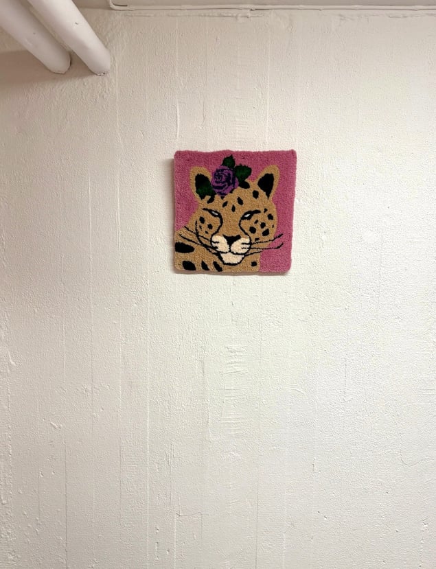 This stunning artwork effortlessly captures the essence of playful confidence, showcasing a majestic leopard beautifully adorned with a vibrant purple rose, set against a striking pink backdrop. The leopard’s calm and almost amused gaze invites viewers to revel in an image of beauty that remains untouched by life's pressures. Titled "För snygg för stress/Too Pretty for Stress," this piece transforms a familiar cliché into a powerful statement of empowerment. Here, the leopard serves as a dual symbol of strength and elegance, embodying a fierce yet tender spirit. The innovative use of soft textile medium introduces a captivating layer, seamlessly blending wildness with intimacy, and asserting that beauty itself can stand as a form of resilient defiance. This artwork not only enchants the eye but also challenges the mind, making it an essential addition to any collection that celebrates the intersection of artistry and profound meaning.