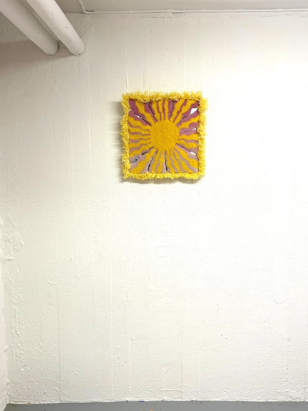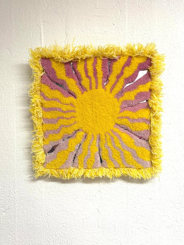 Immerse yourself in the captivating brilliance of this extraordinary artwork, where vibrant yellow and soft pink melodies radiate with the intensity of heat and light. The unique textile surface shimmers and dances like flames or sunrays, transforming delicate softness into a palpable energy that is both playful and fervently alive. Entitled "Het/Hot," this piece conveys a profound narrative that intertwines warmth, desire, and the essence of vitality. Its shaggy edges pulse against the wall, challenging the confines of the canvas while enhancing the exhilarating sense of movement. This artwork becomes a powerful ode to intensity, compelling us to embrace the notion that to burn brightly is to truly live fully. Elevate your collection with this remarkable piece that not only illuminates a space but also inspires a spirited dialogue about the beauty of passion and existence.