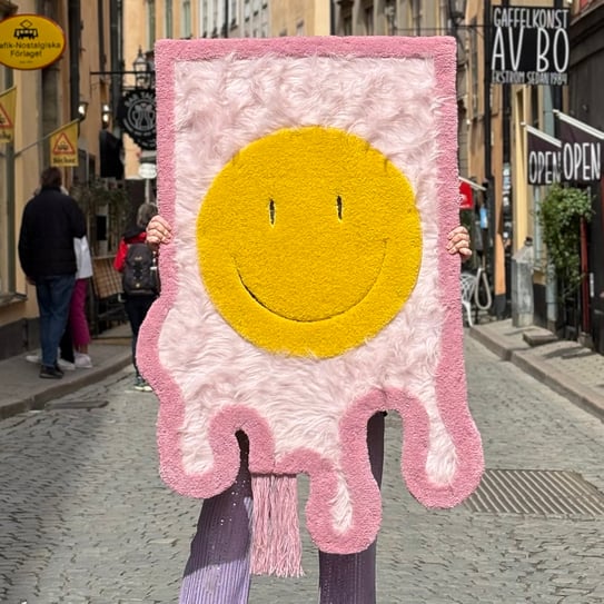 Ingrott leende is a playful yet thought-provoking tufted wool artwork that merges organic texture with expressive form. Featuring a smiley face embedded within a wood grain pattern, this piece blurs the line between nature and emotion. The vibrant yellow and deep black contrast with the soft, fuzzy purple edges, adding a surreal and tactile dimension. Handcrafted with high-quality wool, it has a sturdy backing and is signed by the artist for authenticity. Ingrott leende is a statement piece that captures the beauty of imperfection and the complexity of a smile. Artwork by Maria Vister.