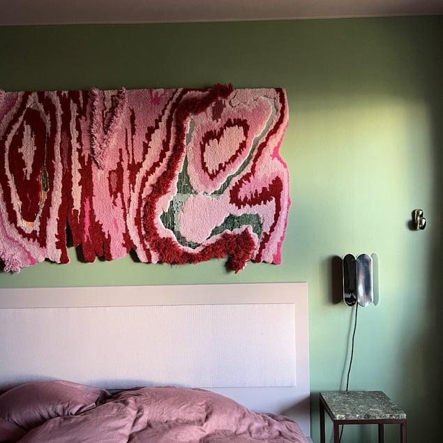 Patina pink is a unique tufted wool artwork that blends organic texture with reflective elements. Inspired by the natural patterns of wood grain, this piece captures the beauty of organic transformation. Handcrafted with a mix of plush wool and shimmering mirror mosaic, it plays with light and depth, creating an ever-changing visual experience. The sturdy backing ensures durability, and the piece is signed by the artist, marking its authenticity. Patina is more than a textile piece—it's a statement of movement, texture, and reflection. Artwork by Maria Vister.
