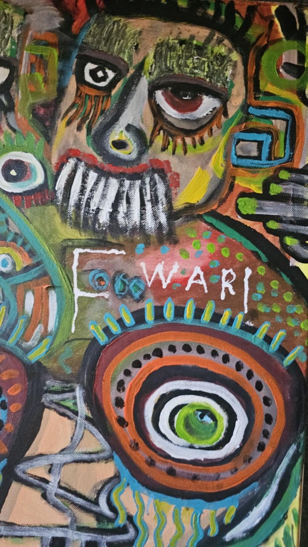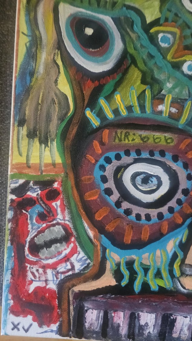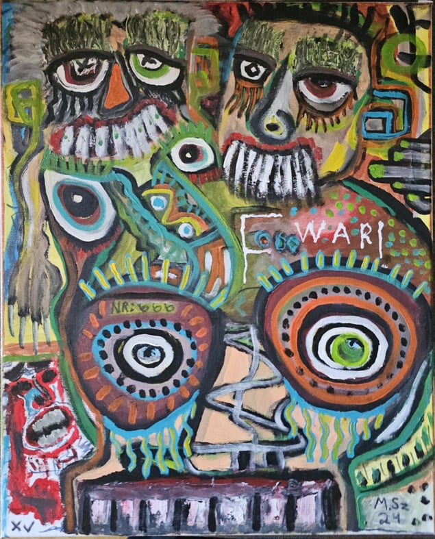 This one is painted on a 50x60 cm canvas with Acrylics, Pro-Markers and Posca pens. The message is clear but I don't think my mind was, "Fuck war!". This one is from 2024 so it's abit older.