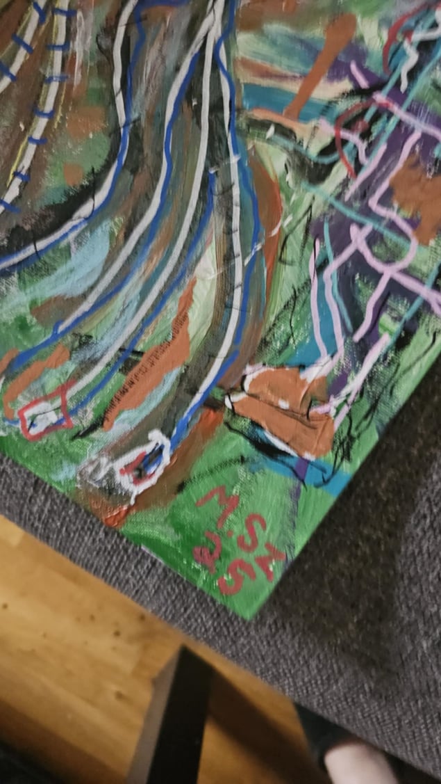 Hatkärlek till Kaos means Love/hate relation to chaos. It's sometimes how I feel about my art. I love and hate the chaos. This one I stayed up all night painting because I couldn't sleep until I was done, due to obsessive thoughts. It's made with Acrylic paint and Posca pens. It's made on a thin panel canvas.