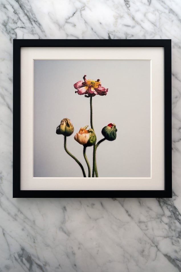 These poppies were photographed with studio light in my studio. This film print is printed on fine art paper and includes a high quality wooden frame with antireflective glass. This photograph was taken with my Hasselblad 500cm using Kodak Ektar film. Limited Edition 1/50 Frame size: 50x50cm NB The image on this website is under 5mb whereas the printed image will be done using a film scan that is over 100mb. This means you will receive a very crisp and detailed photograph.