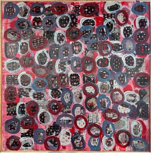 This painting is from a dream series and is depicting a field of red tulips -the circles represent energies creating a poetic rhythm and ripples of memories.