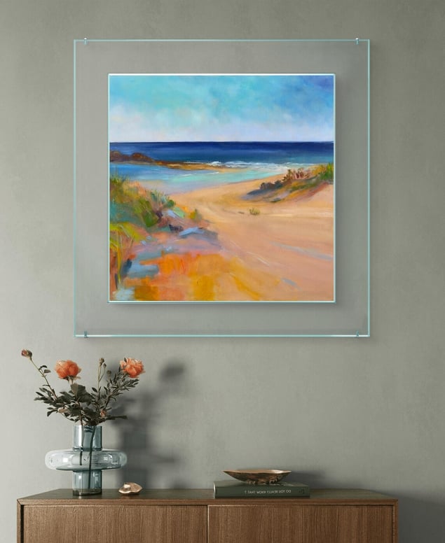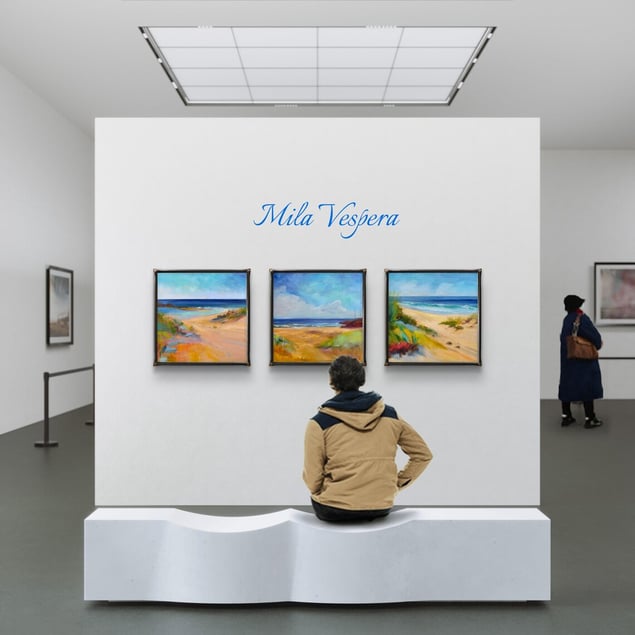 Seaside Serenity Original. Oil on canvas The first work in the Sea Whispers series, Seaside Serenity, invites you to immerse yourself in the tranquil beauty of the coastline. This piece captures the essence of a serene seashore, where the soul dissolves into the infinity of waves and the softness of windswept dunes. Gentle shades of blue, beige, and green blend in harmonious balance, awakening forgotten dreams of a secluded shore — a place where time stands still in nature’s quiet embrace. Perfect for adding a calming presence to any space, this painting is a lyrical homage to the vastness of the sea and the stillness it brings. Sea Whispers is a collection of painted meditations, where the sea does not roar — it whispers. Each painting is a paused moment, filled with light, the breath of wind, and the silence in which nature begins to speak. The artist explores not merely the landscape, but a state of being — where the gaze dissolves into the horizon and the soul slows to match the rhythm of sand, waves, and sky. Through the play of light and color, through the movement of grasses, the shimmer of sun, and the shifting hues of the sea, the series evokes a presence — a place where nothing rushes, and every instant holds quiet meaning. These are more than seascapes — they are whispers, spoken in the language of the sea for those who choose to listen. Each work can be read like a poem written in brushstrokes — capturing silence, wind, light, and time.
