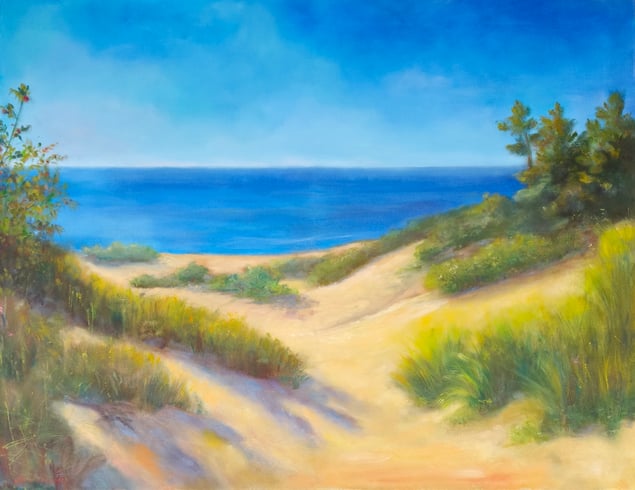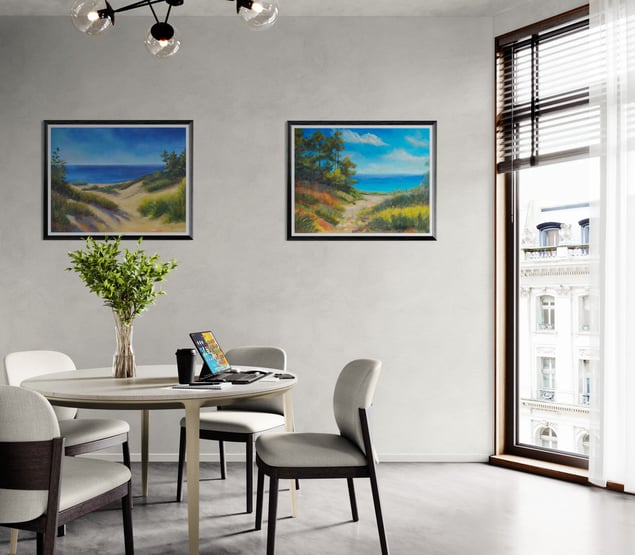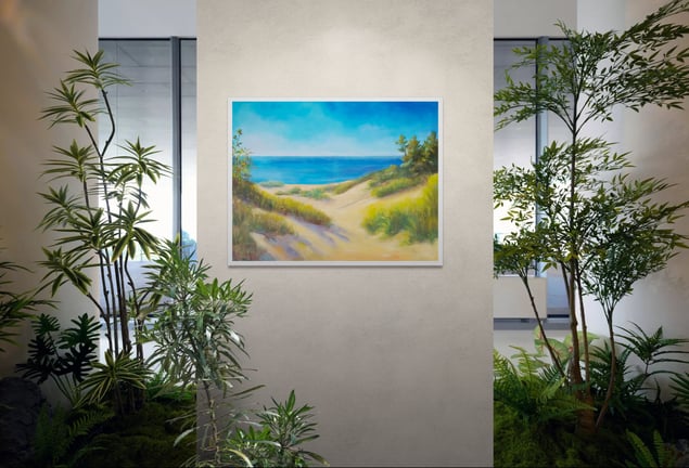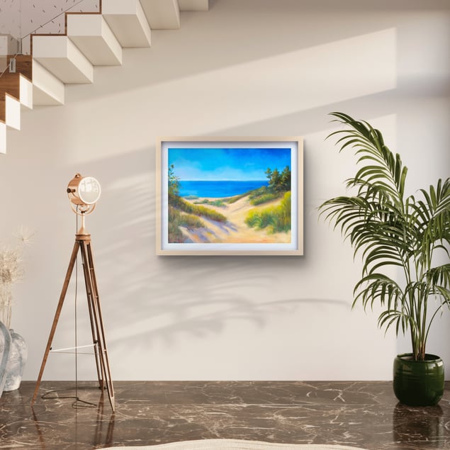 “What Remains Is the Blue” is a memory dissolved in light — a landscape where all that is fleeting seems to have quietly passed, leaving behind only stillness, the warmth of sand, and the endless blue… as if that alone is what endures. The artist guides the eye through sunlit dunes, among grasses bowing in the breeze, toward the place where sea meets sky. Here, light does more than illuminate — it permeates, it lingers, it stays. Everything feels steeped in a gentle longing for what slips away, yet never vanishes without a trace. The blue — it is the sky, it is the sea, it is what remains when all is said. This painting becomes a meditation on the imprint of moments: elusive, yet unforgettable; deep, like the color that stays behind in the heart.