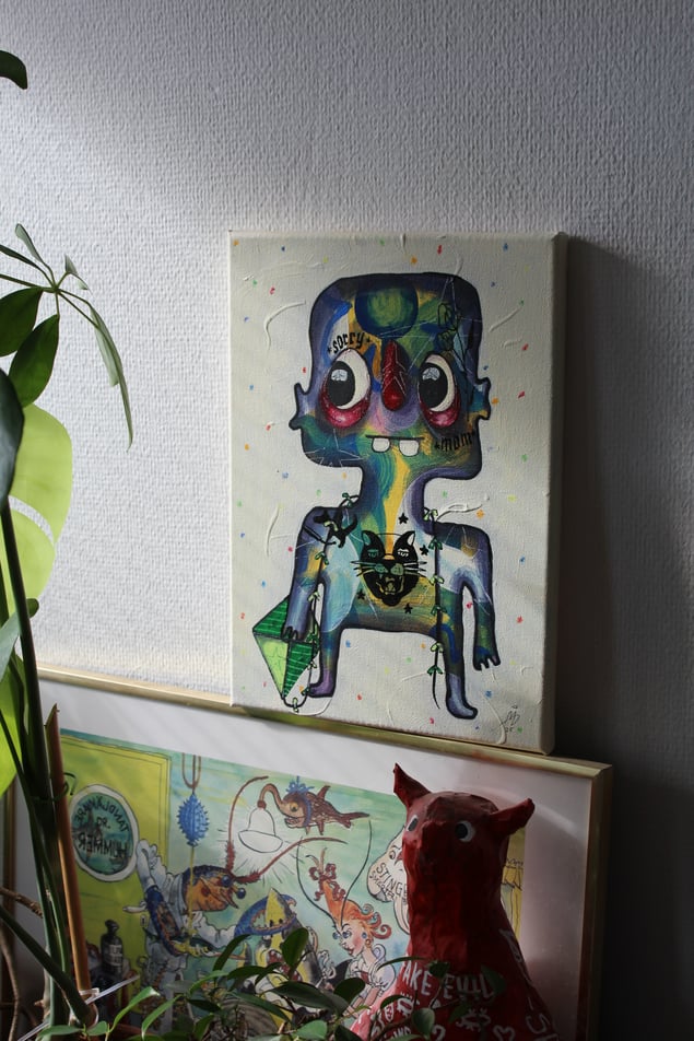 Tiny Tim's is a collection of 5 small paintings of Tiny Tim. Tiny Tim is a childlike character, however jaded by adulthood. Tiny Tim is an inner child, still desperately clinging onto play for as long as possible. The small paintings are colorful and stylish, however still rather minimalistic. An easy way to add a bit of color to any room.