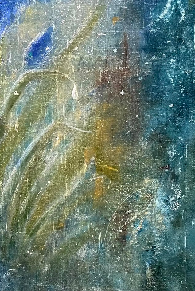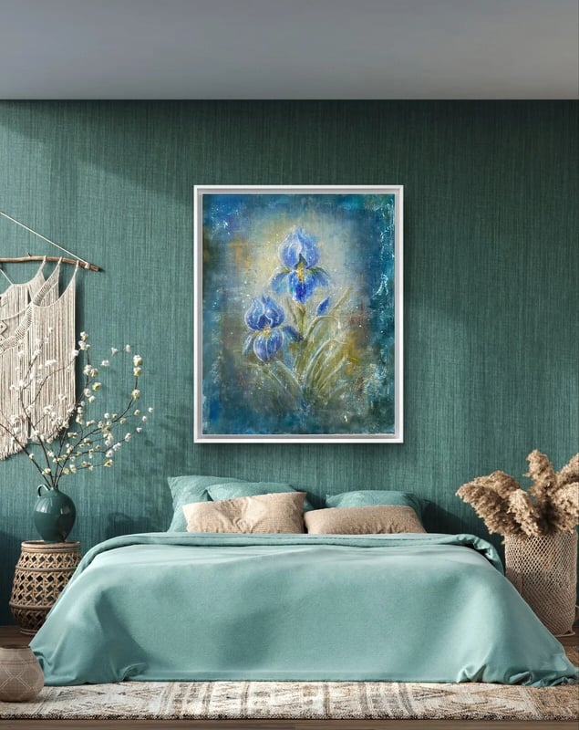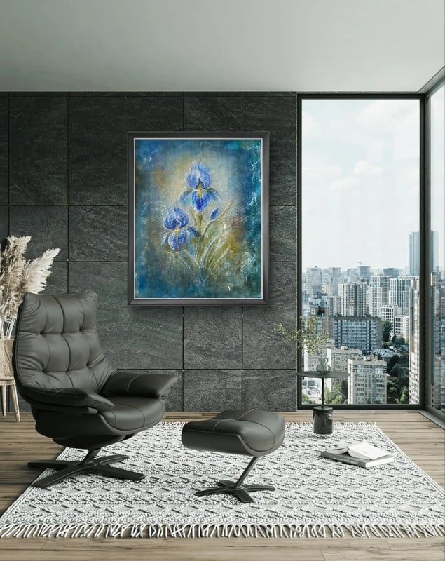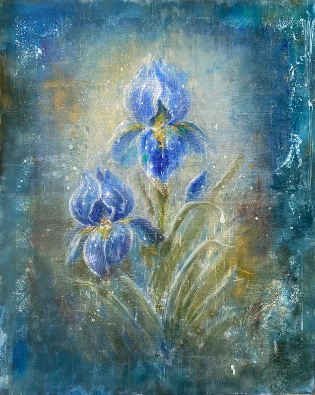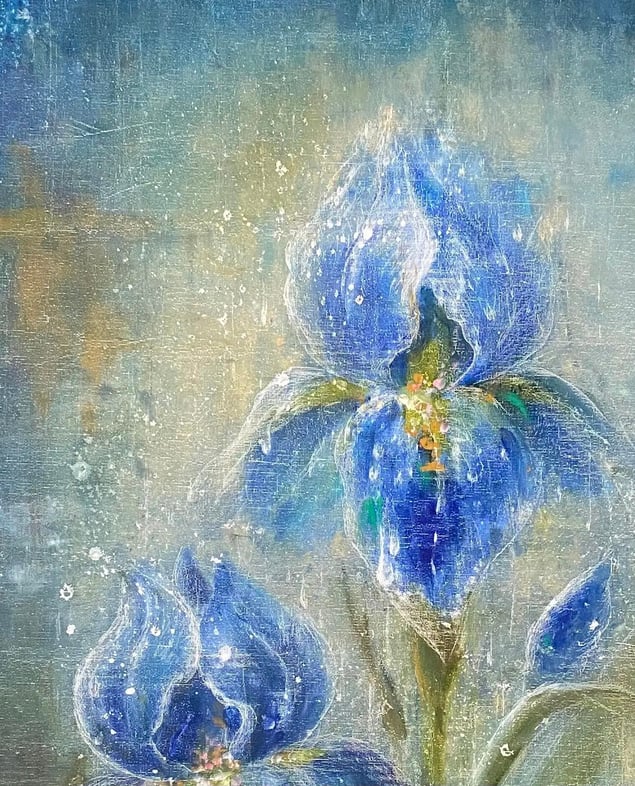 In Irises in Rain, soft blue petals shimmer beneath a gentle rain. Through expressive brushwork and subtle layers of light, the painting captures both fragility and quiet resilience — a poetic dialogue between nature and emotion. The irises seem to breathe with the rhythm of the rain, inviting the viewer into a moment of calm renewal.