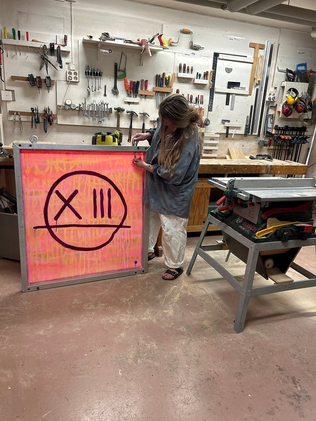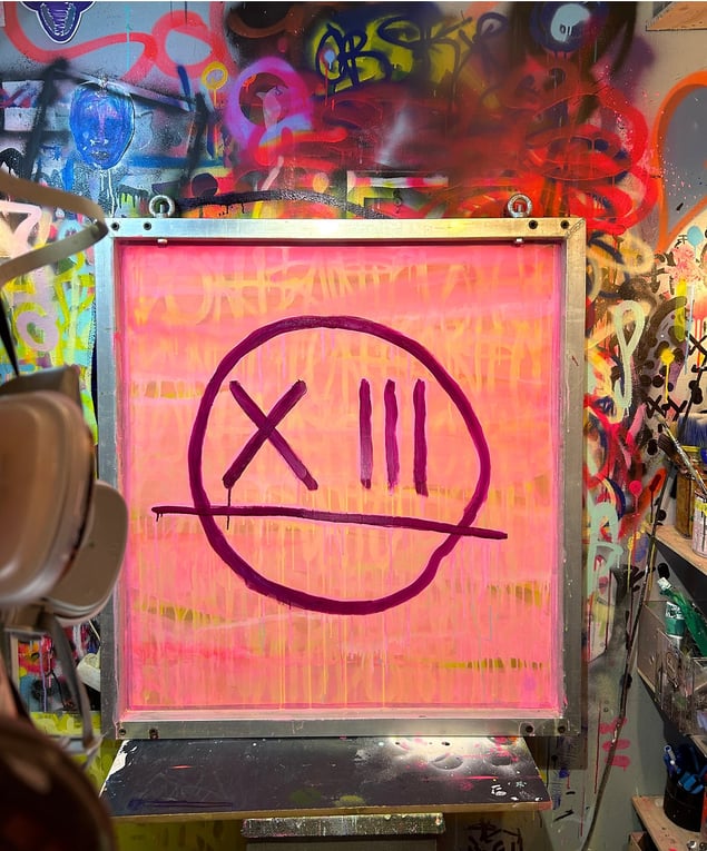Mixed media, with acrylic, pen, and spray on old screen printing frame. The frame was sourced from a defunct printing house and retains marks and traces of its industrial past, allowing the history of the frame to naturally integrate into the new artwork. Made from aluminum, the frame is lightweight and has a similar weight to a traditional painting. It can also be easily hung directly on the wall, like any other frame, with the loops and chains easily removed if desired. The screen printing mesh is semi-transparent, allowing light to pass through and creating a piece that changes dynamically with both the background and the time of day. The mesh also allows the paint to bleed through, producing a slightly distorted, reversed shadow of the motif on the reverse side. This makes the piece captivating from both the front and back—a quality that has occasionally been utilized by hanging the artwork in the center of a room.