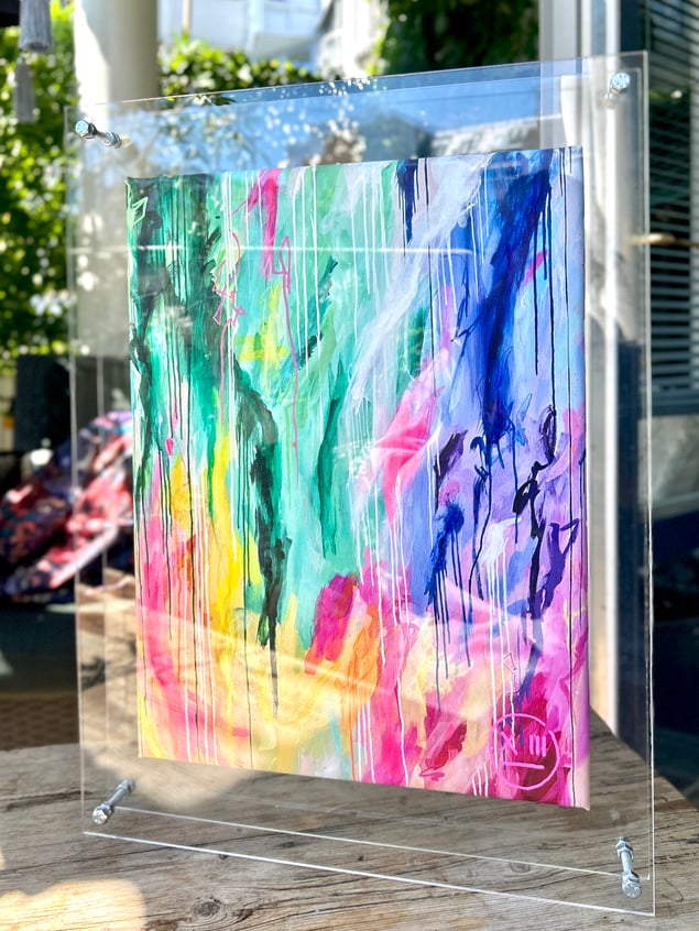 Limited edition print on canvas, mounted in plexiglass. Signed and numbered, with hand-painted details on both the canvas and the plexiglass. Can be displayed freestanding as a sculptural piece, or mounted on the wall.