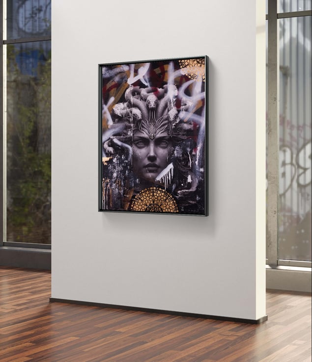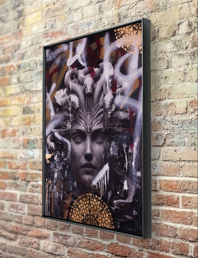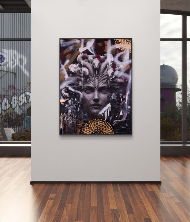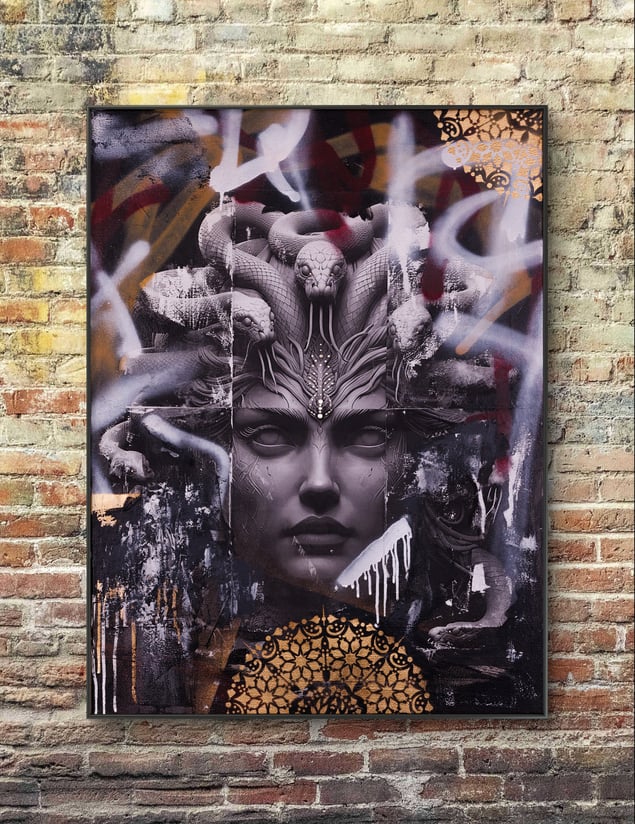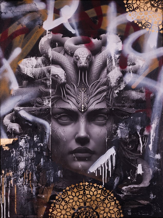 In this piece, Medusa is reborn as a symbol of power, transformation, and the allure of the forbidden. Her gaze is both feared and captivating—a reminder that beauty and danger often coexist. The work blends a raw, contemporary expression with spray paint techniques, golden ornaments, and graphic contrasts. Myth and modernity are interwoven, the eternal meeting the urban. She embodies duality—both destroyer and guide—forcing the viewer to confront their fears, fascinations, and perceptions of power. Medusa is a visual journey through the darkness of myth, in search of the strength found in what was once feared. Themes: Mysticism. Duality. Transformation. Destruction. Guidance.