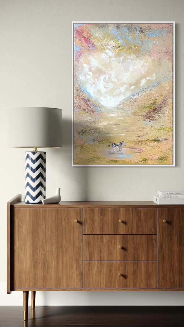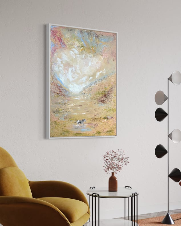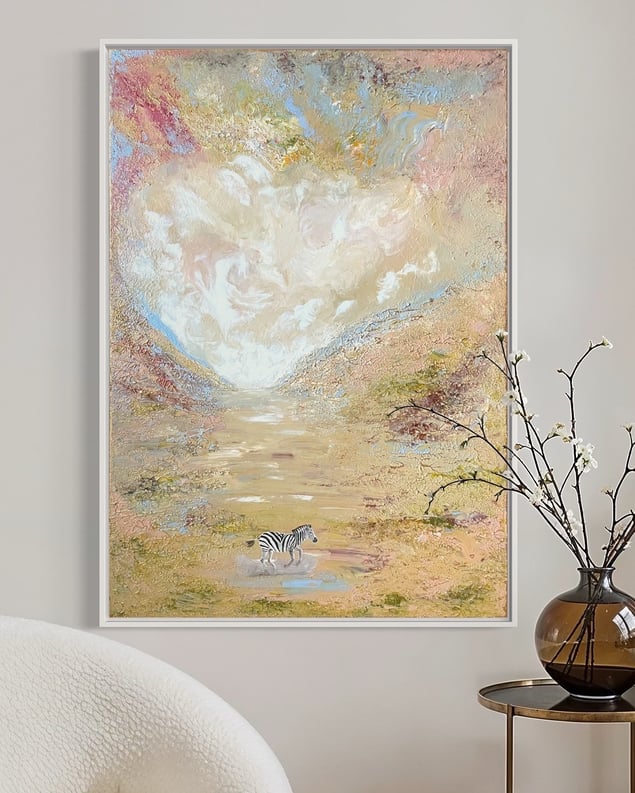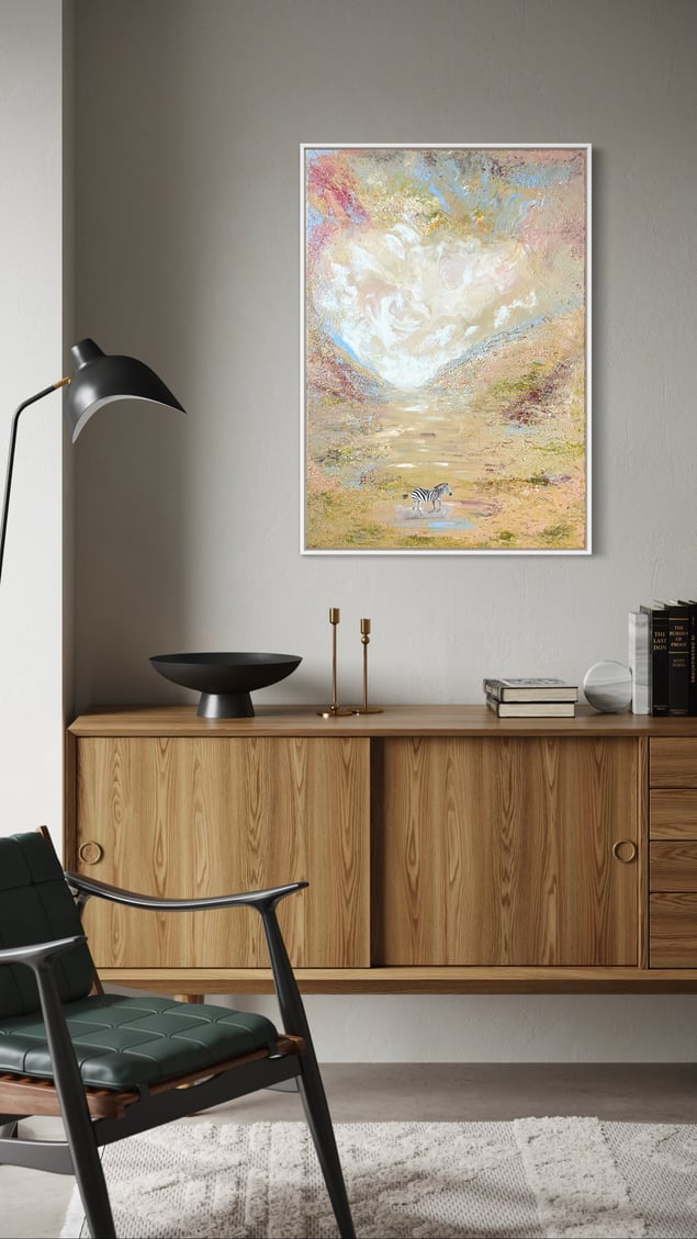 Born to run free, (2025). Size: 70 x 100 cm. Original painting on 3,5 cm deep canvas, framed in a white floating frame. It doesn’t hesitate. The earth opens, the sky lifts and it runs. Not from fear, but from knowing: it was never made to stand still. Its freedom is not a destination, it’s a motion, a remembering. All original paintings are unique and signed. A certificate of authenticity is included.