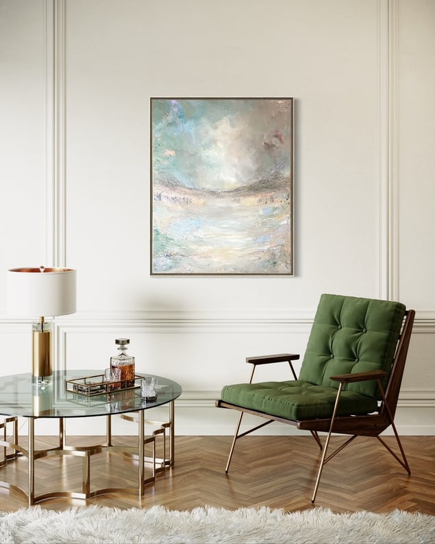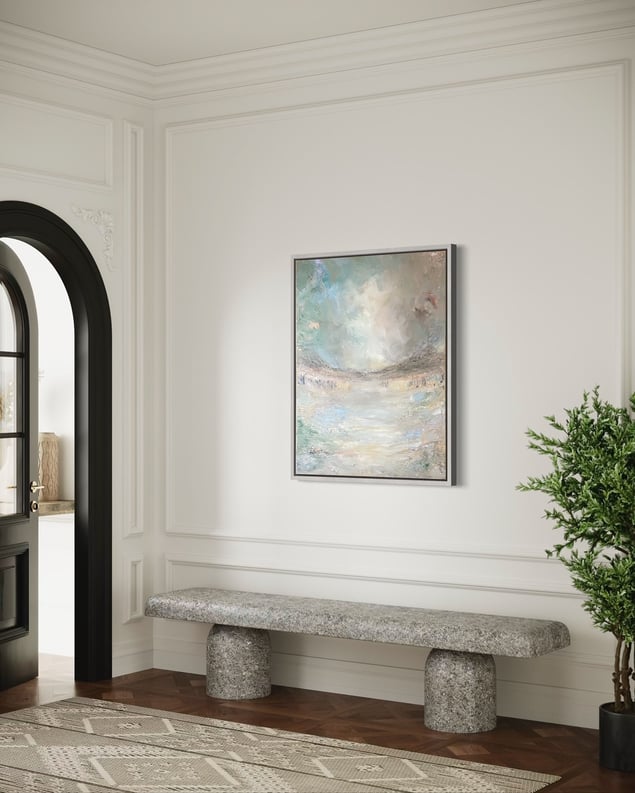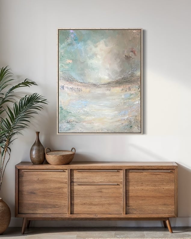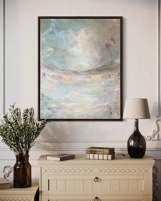 Serenity, 2025 Embark on a journey into a realm where dreams intertwine with memories, captured beautifully in this masterfully layered abstract landscape. "Serenity" invites you to experience a harmonious balance of tranquility and strength. The atmospheric palette, featuring soft blues, muted greens, and warm neutrals, crafts a mesmerizing interplay of light and texture that speaks to the soul. Accents of metallic gold add an enchanting sparkle, allowing the artwork to glimmer with a life of its own. Let this piece transform your space into a sanctuary of calm and inspiration, making it a perfect addition to any art collection.