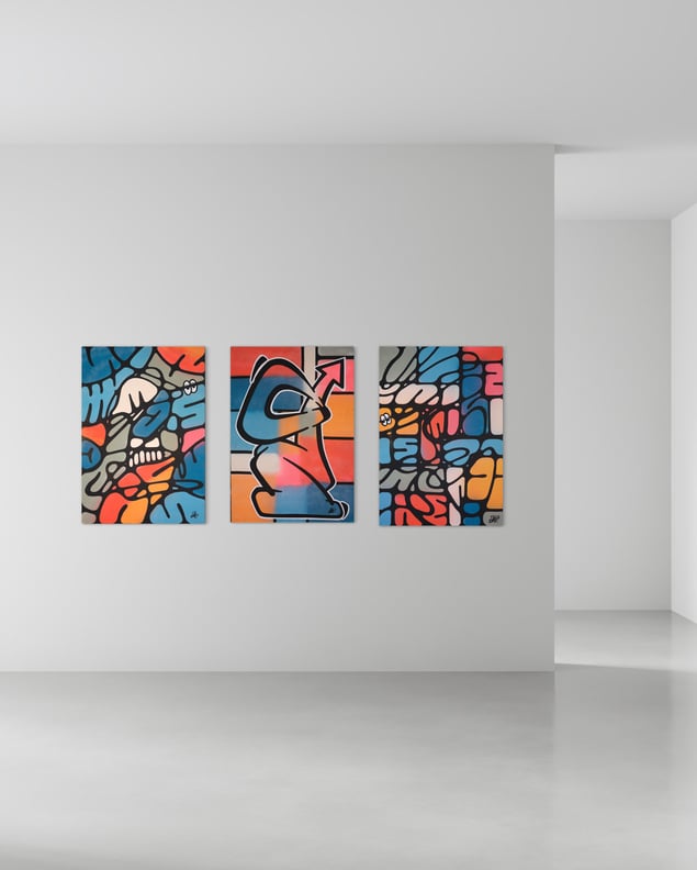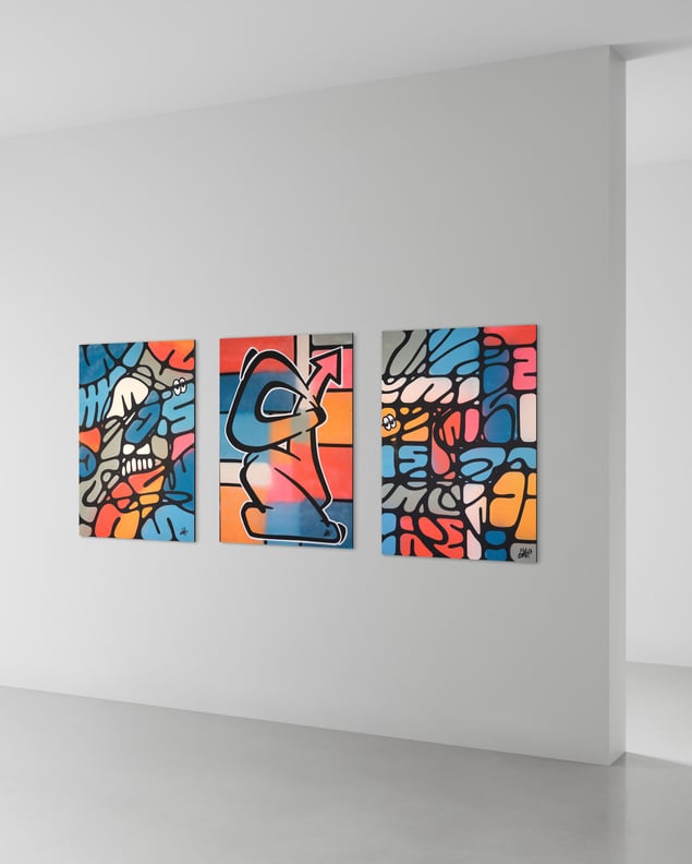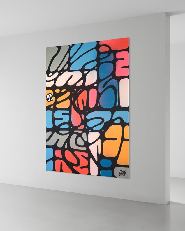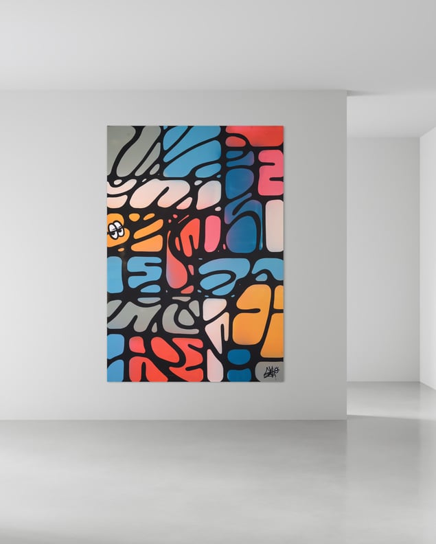 A vibrant interplay of colors and shapes that merge to form mysterious, abstract scenes. The painting is created with spray paint and markers on a 10mm thick plastic sheet. Of course with a hint of "street art".