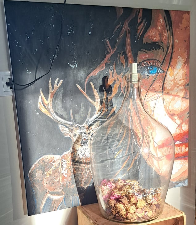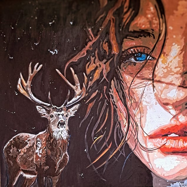 Upplev skönheten i denna fängslande akrylmålning på canvasduk, där en harmonisk fusion av porträtt och djurmotiv skapar en visuell berättelse fylld med liv och känsla. Varje penseldrag bär med sig en djup kärlek till både människans och naturens värld, vilket ger verkets karaktär en extra dimension. Denna unika konstverk kommer att berika din samling och bjuda in till en djupgående reflektion, samtidigt som den tillför en känsla av elegans och autenticitet till ditt rum. Låt denna konstnärliga skapelse bli en del av ditt hem och en källa till inspiration dagligen.