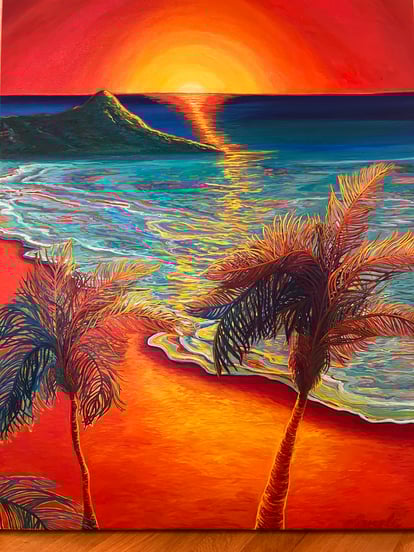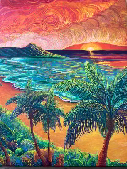 Paint gardens, memories from wonderful places such as Tuscany, Provence, Hawaii and Latin America, cats, birds and serene landscapes. Bright colors.