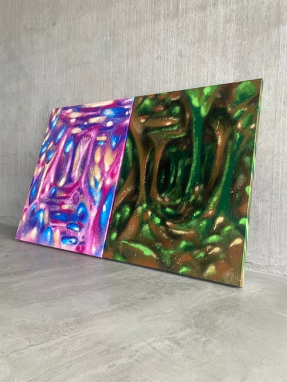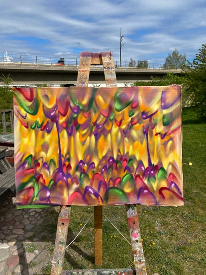 My spray-painted works, on the other hand, tend to come together more quickly, as spray paint is a fast and fluid medium. These pieces are often unplanned — I let instinct and emotion guide the outcome. I know that I am on the right path with this style. SKUNGELJORD ("skog","jungle" and "underjord" combined) is truly a unique style that I will keep on evolving.