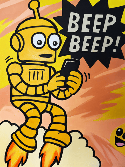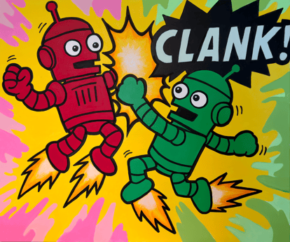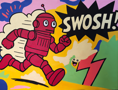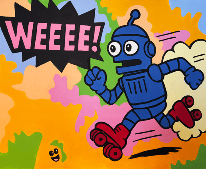A Day in the Life of Robots is Emanuel Ringborg Mankert’s first solo exhibition – a pop-art tribute to colour and joy. All works are painted in acrylic on canvas.