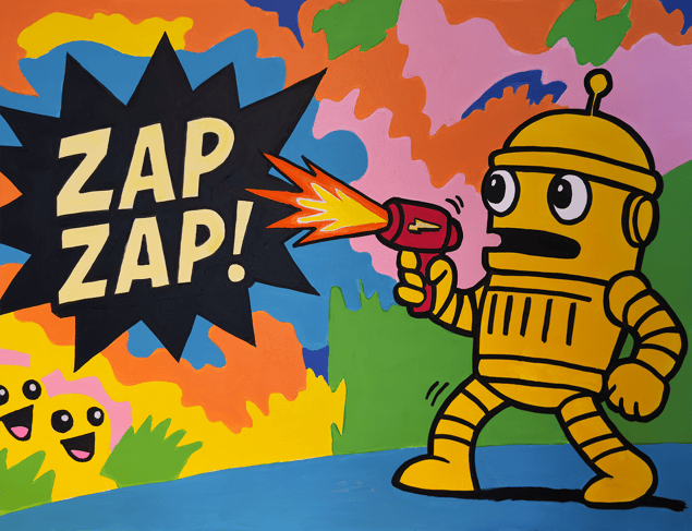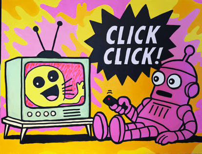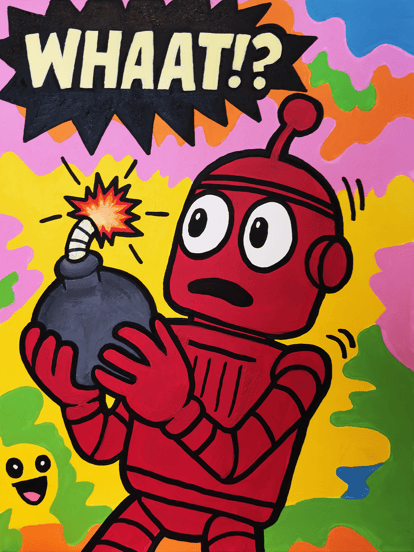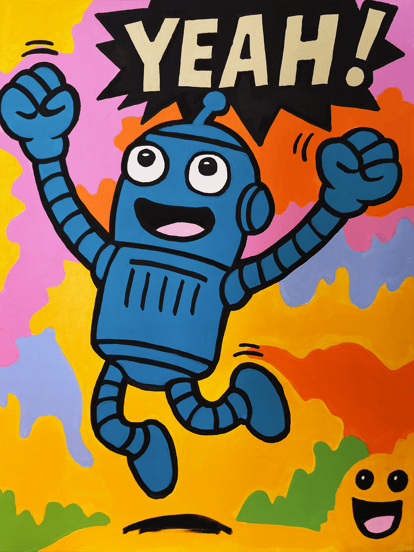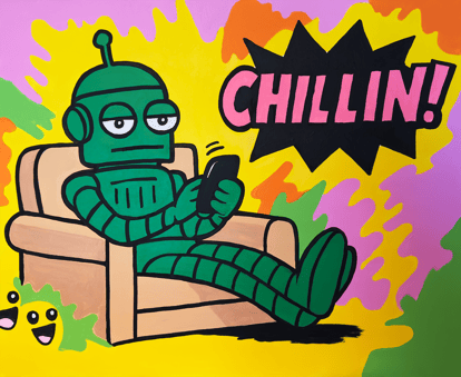 Each image is like a comic-book panel where the robots express some form of pure, unfiltered feeling – it might be joy, shock, surprise, or simply a bit of laid-back relaxation. Something many of us might benefit from allowing ourselves to feel more of, in an everyday life where we are flooded with impressions and try to navigate an increasingly complex reality.