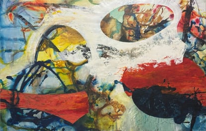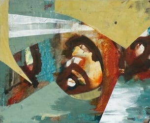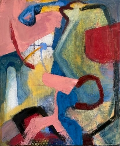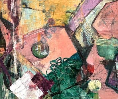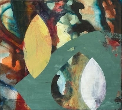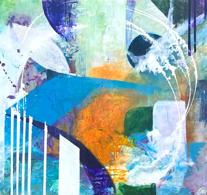 Abstract colourful acrylics on canvas, paper, wood panel, and mixed media, collage, watercolor
