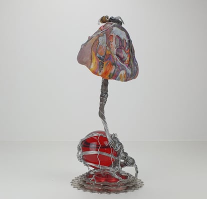 I tie and weave scrap metal together with wire to form a skeletal structure, which I then build upon with clay to create my sculptures.