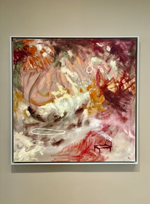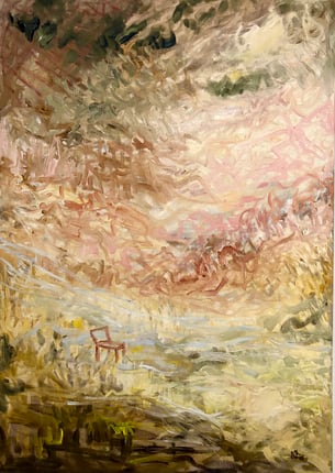 I use broad, sweeping brushstrokes alongside intricate markings to create dynamism and rhythm. Simple, graphic forms often emerge—symbolic elements that act as visual keys or focal points within the composition. These may appear spontaneously or recur throughout my work, such as a red chair, a white curve, or a structure that disrupts the more organic forms.